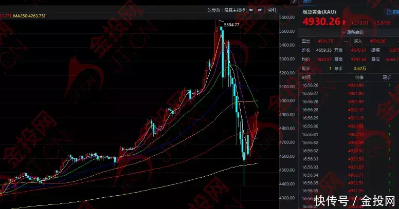 隔夜,现货黄金在欧盘前一度跌至4402.93的日内低点,随后有所反弹,单日振幅达480美元,最终收跌4.59%,报4660.91美元。今日欧市盘中,黄金大幅反弹,目前在4905美元附近徘徊。