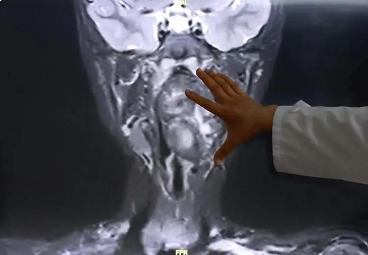 近日,小亮来到复旦大学附属儿科医院就诊,经增强CT及磁共振检查,明确小亮所患的肿瘤约7×3.5×3cm,犹如“拳头”般大小。专家表示,该肿瘤紧邻颈内动静脉并将血管明显向外推移,肿瘤向咽喉腔内隆起,占据大部分口咽及下咽腔,严重压迫声门,随时可能发生窒息。